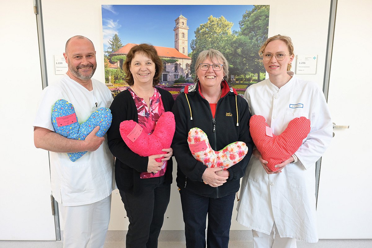 „Alles Gute, viel Kraft, Hoffnung und Zuversicht wünschen Ihnen Gabi und Heike“ – diese kleine Grußbotschaft, versehen mit Herzchen und Smileys, hängt an jedem einzelnen Kissen, das Gabriele Reuschl und Heike Kizer genäht haben. Seit mittlerweile fünf Jahren unterstützen die beiden Frauen die Brustkrebspatientinnen der Frauenklinik des Uniklinikums Erlangen mit handgenähten Herzkissen. Jetzt brachten sie erneut sieben große Säcke voller bunter Unikate vorbei – neben 300 Herzkissen befanden sich darin auch jeweils 300 kleine Port- und Gurtkissen.