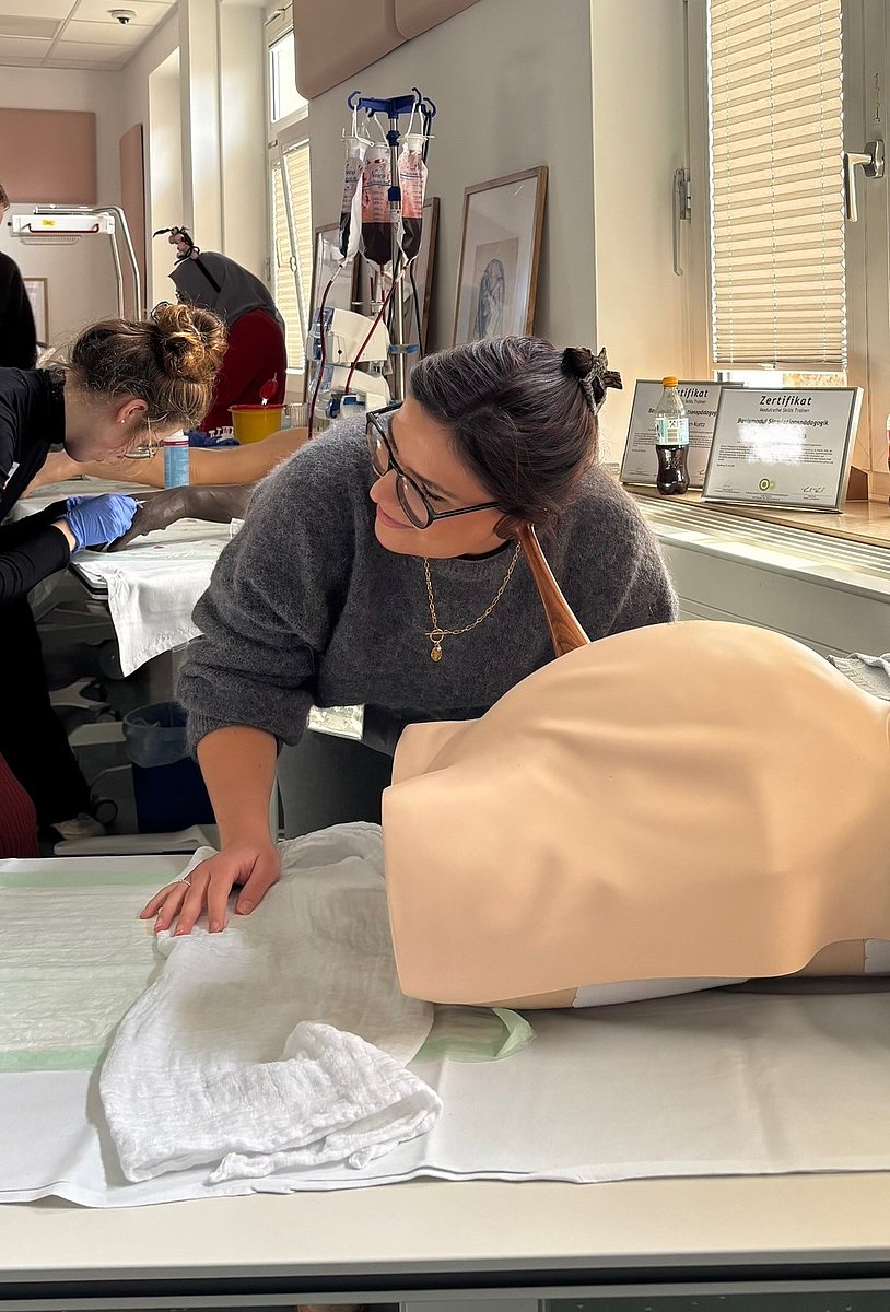 Ein besonderer Programmpunkt war die Vorstellung des Skills Lab, in dem verschiedene Lehr- und Trainingsmodelle präsentiert wurden. Besucherinnen und Besucher konnten unter Anleitung selbst aktiv werden – etwa beim Abhören kindlicher Herztöne mit dem Pinard-Hörrohr, beim Ertasten unterschiedlicher Lagen des Kindes im Mutterleib oder beim Legen von Zugängen an Arm-Modellen. Zudem wurden Stationen zu den Themen Schwangerschaft, Geburt und Wochenbett angeboten, die den praktischen und kliniknahen Charakter des Studiums erlebbar machten.