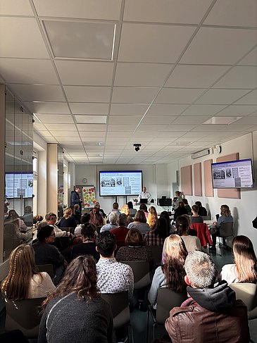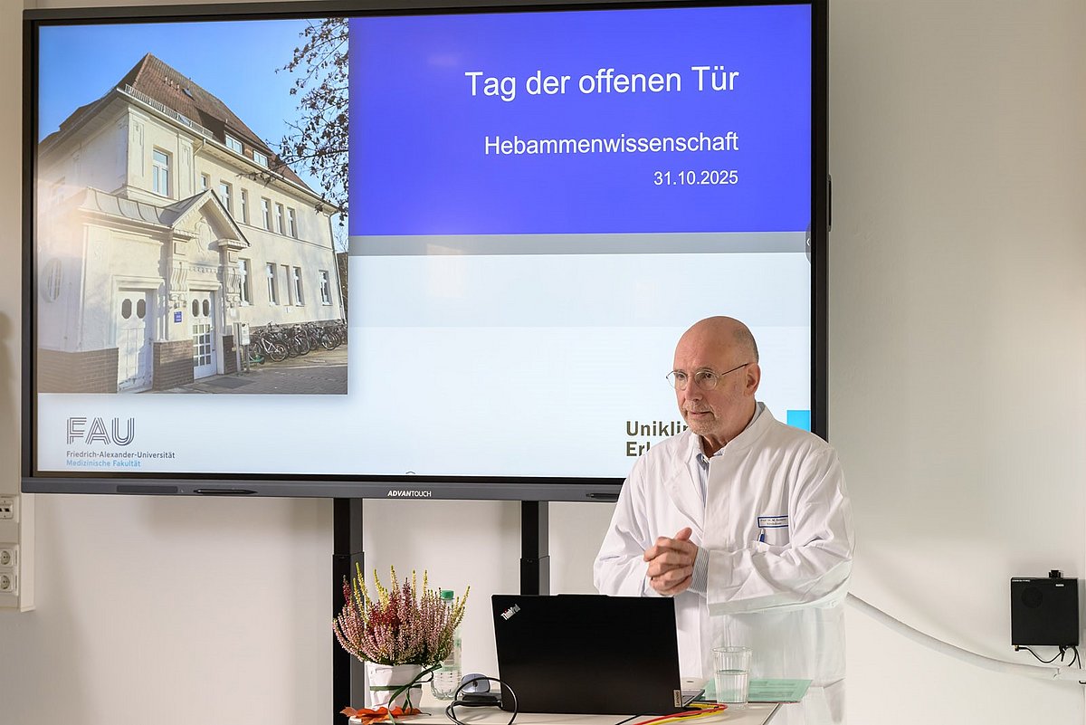 Der Studiengang Hebammenwissenschaft lud am 31. Oktober 2025 zu einem Tag der offenen Tür in die neuen Räumlichkeiten in der Carl-Thiersch-Straße in Erlangen ein. Im Rahmen der Veranstaltung bedankte sich das Team bei allen Wegbegleiterinnen und Wegbegleitern, die die Gründung und die erfolgreiche Etablierung des Studiengangs an der Frauenklinik des Uniklinikums Erlangen und an der Friedrich-Alexander-Universität Erlangen-Nürnberg unterstützt haben, und hieß sie am neuen Standort herzlich willkommen.