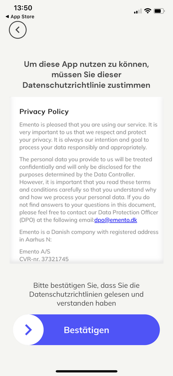 Bitte bestätigen Sie, dass Sie die Datenschutzrichtlinie gelesen und verstanden haben durch Schieben des Pfeils von links nach rechts.