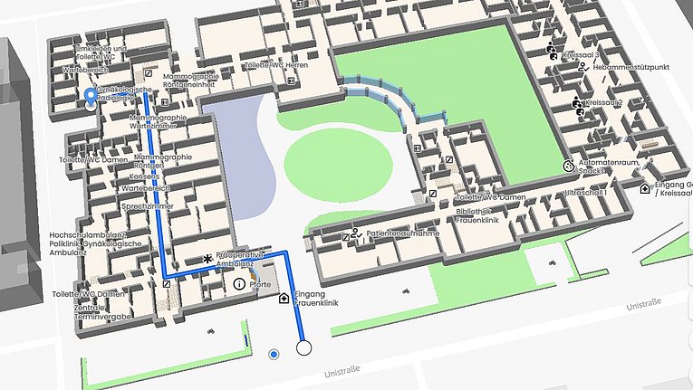 Damit Sie sich in unserer Klinik schnell und sicher zurechtfinden, bieten wir Ihnen eine moderne Innenraumnavigation. Egal ob Sie zu einer Sprechstunde, zur Anmeldung oder Angehörige im Patientenzimmer besuchen möchten – unsere digitale Wegführung zeigt Ihnen den schnellsten Weg direkt auf Ihrem Smartphone. Dazu rufen Sie untenstehenden Link auf und geben in der Suchleiste oben links Ihr Ziel ein (z. B. Patientenaufnahme oder eine Zimmernummer). Sie erhalten sofort eine visuelle Wegführung mit Gebäudeplan inklusive Etagenwechsel. So kommen Sie auf schnellstem Weg an Ihr Ziel.